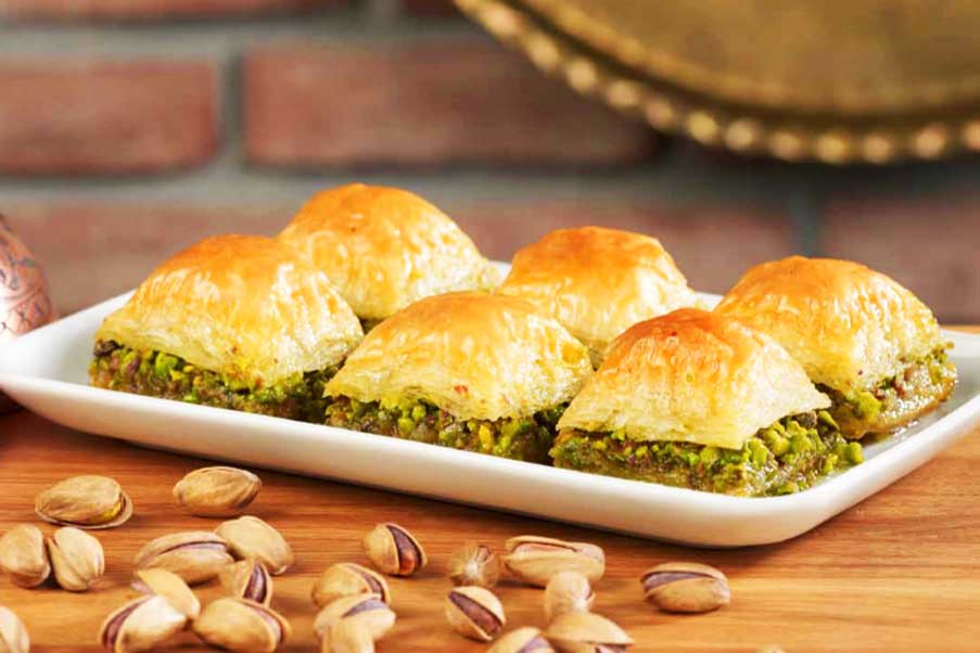 ✅ Baklava - là một món tráng miệng ngọt ngào và phổ biến trong ẩm thực Trung Đông. Nó được làm từ các lớp bánh mỏng xen kẽ với hạt điều hoặc hạnh nhân, được ướp mỡ và nước mật.