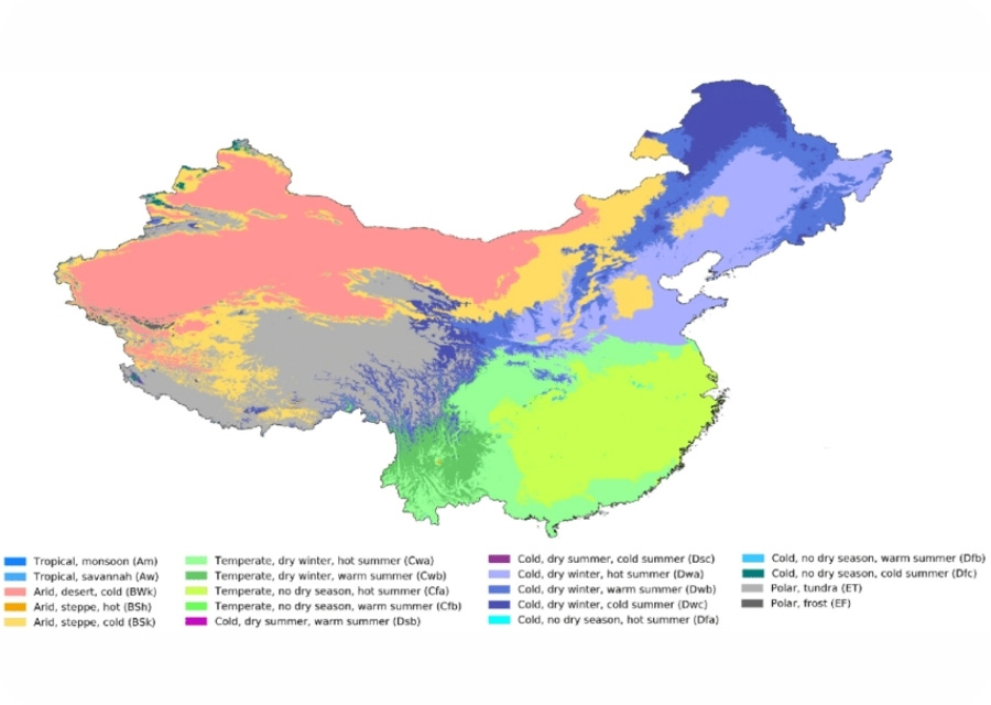 Bản đồ khí hậu Trung Quốc có sự khác nhau giữa các khu vực . Càng lên phía Bắc, khí hậu càng lạnh với các kiểu khí hậu như: nhiệt đới, ôn đới, và ôn đới lạnh. Ngoài ra, Trung Quốc còn có hệ thống núi lớn với các kiểu khí hậu thay đổi theo độ cao.