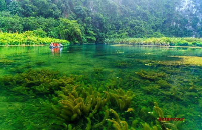 -Đi tour Tràng An, ở trên thuyền, các bạn đừng quên quan sát dưới mặt nước nhé. Dưới bề mặt nước Tràng An như một thế giới mới với hệ thống sinh vật thuỷ sinh kết nối với nhau đung đưa trong nước như xanh cả một vùng trời.
