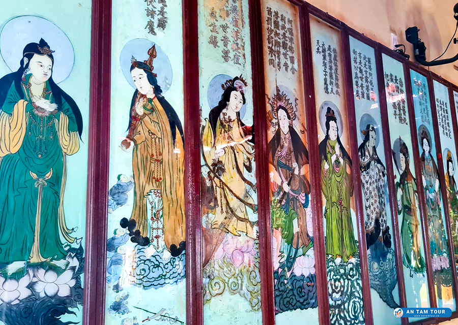 Trong chánh điện, ngoài bàn thờ Phật ở giữa, hai bên còn có bàn thờ các vị Bồ Tát. Phía sau các bàn thờ này trang trí 6 bộ tranh thiên thủ thiên nhãn vẽ ngược trên kiếng rất có giá trị - có thể nói đây là bộ tranh cổ duy nhất của Nam Bộ.