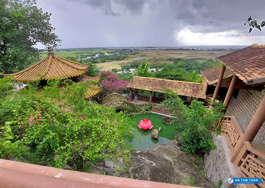 Đứng trên chùa nhìn xuống, bạn sẽ thấy hình ảnh thiên nhiên thanh bình, trong lành của vùng đất miền Tây thân thương.