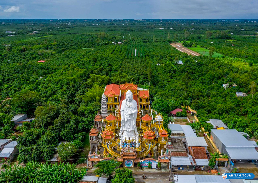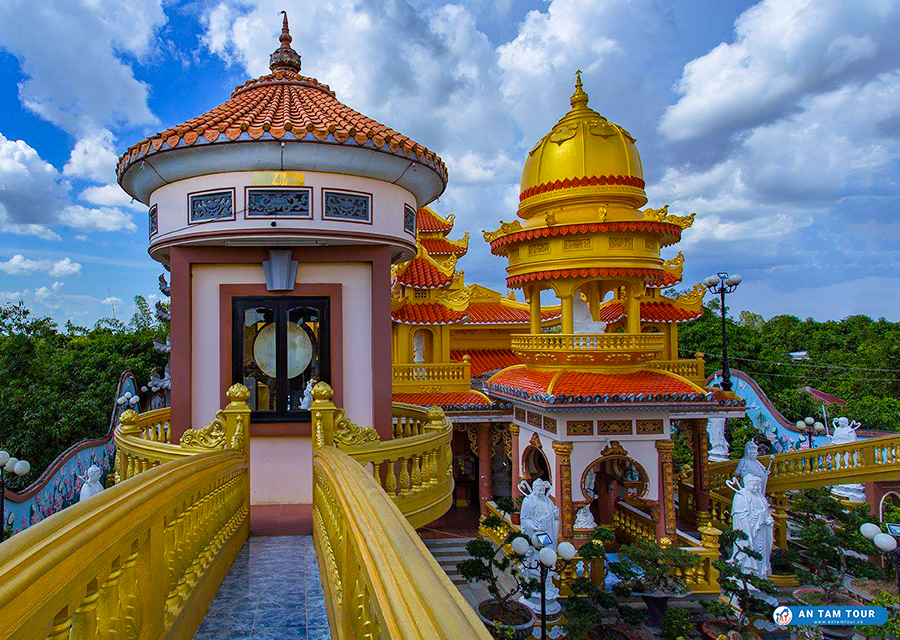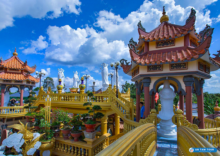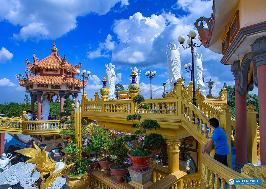 Nếu đứng từ sân lạy Phật hay ở hành lang trên cao nối liền các tòa tháp và đưa tầm mắt ra xa xa, bạn còn được chiêm ngưỡng khung cảnh bạt ngàn sắc xanh với nhiều cấp độ khác nhau của bầu trời và vườn cây ăn trái ở Cù Lao Giêng, thể hiện sức sống mãnh liệt và sự trù phú của vùng đất ven sông.