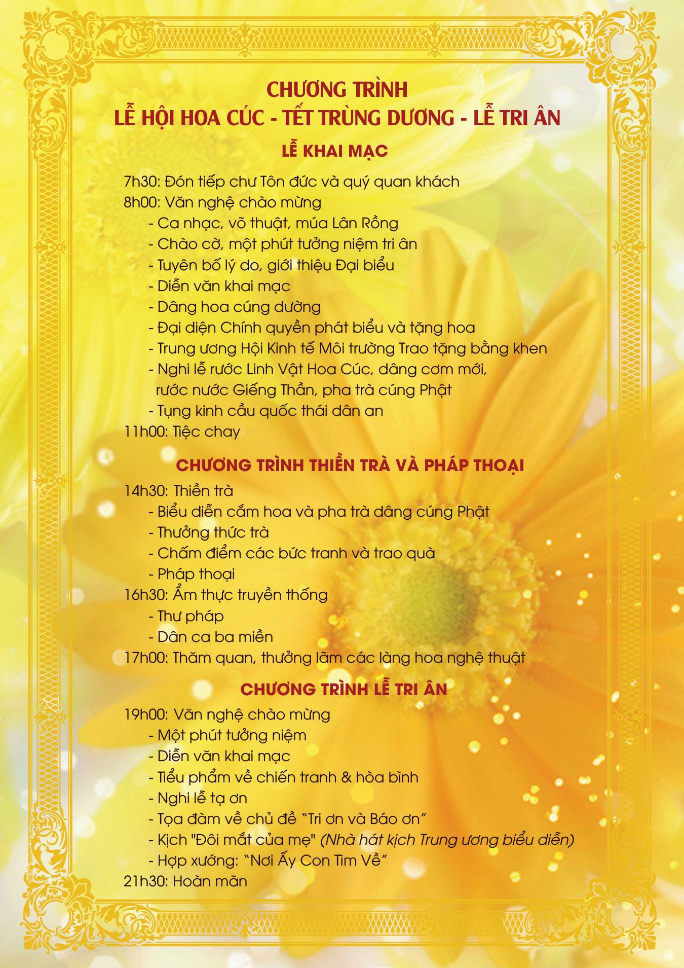 Lễ hội phục dựng và hội tụ những nét đẹp của đời sống văn hóa truyền thống dân tộc Việt với nhiều chương trình đặc sắc gắn liền hoa Cúc trong văn hóa Phật giáo, dân tộc. Tâm điểm chương trình nhằm hướng mọi người tới những giá trị Chân – Thiện – Mỹ, lòng Tri ơn Báo ơn của chúng ta đối với cha mẹ, thầy tổ, quốc gia xã hội, Tam Bảo cùng chúng sinh vạn loại.