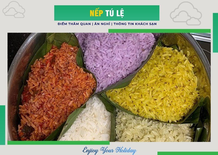 Xôi ngũ sắc Tú Lệ: Đây là một món ngon kết hợp từ nếp Tú Lệ với nhiều nguyên liệu khác nhau, tạo nên một xôi ngon mắt và hấp dẫn. Thường người ta chế biến xôi ngũ sắc bằng cách nấu nếp với các nguyên liệu tự nhiên như lá chuối, lá dứa, lá bạc hà, lá cẩm, rau câu để tạo ra những màu sắc và hương vị đa dạng. Xôi ngũ sắc thường được trang trí bằng các loại hạt, hạt điều, hạt lựu, dừa bào, tạo nên một món ngon mắt và hấp dẫn.