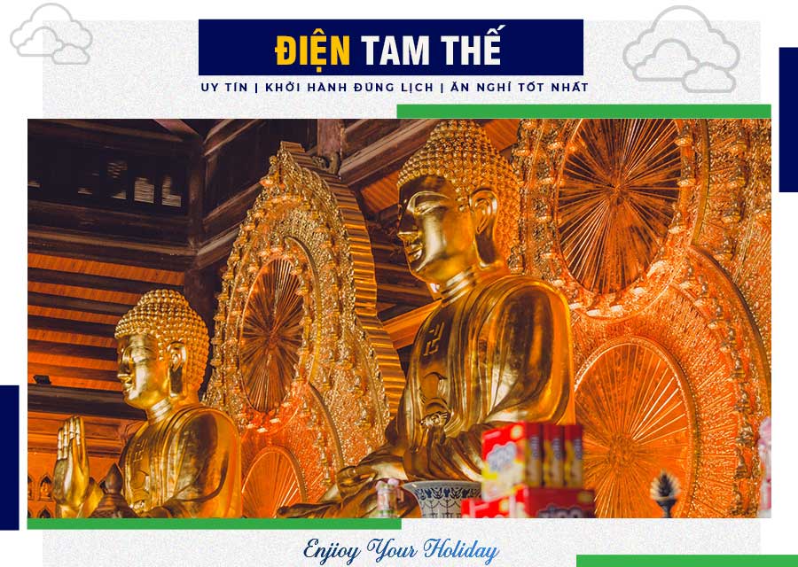 ✔️ Trong điện Tam Thế đặt 3 pho tượng Tam Thế bằng đồng nguyên khối, mỗi tượng cao 7,2m, nặng 50 tấn đều dát vàng trên ba bệ cao 1,5 m, ốp đá thước chạm khắc hoa văn trồng rất bề thế. Ba tượng Tam Thế do nghệ nhân bàn tay vàng Vũ Duy Thuấn cùng các nghệ nhân đúc đồng ở thị trấn Ý Lâm, huyên Ý Yên, tỉnh Nam Định đúc.