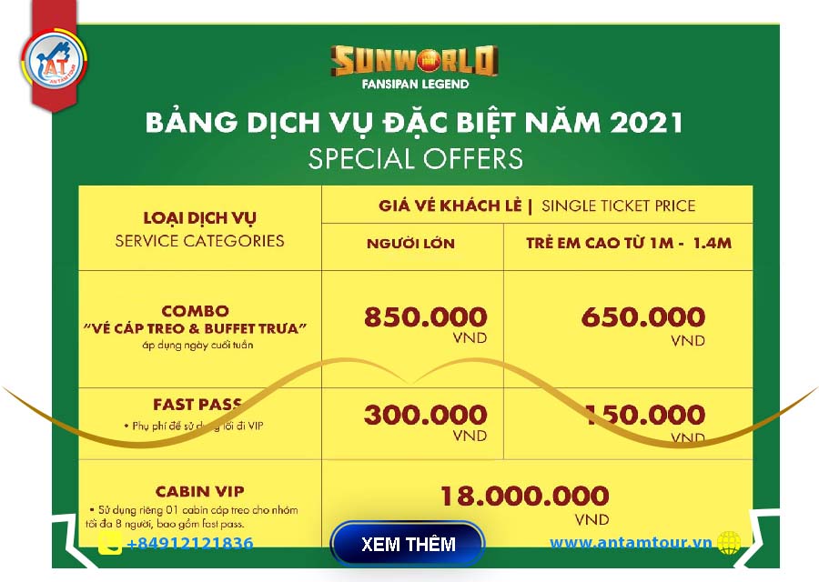 Tập đoàn Sungroup có điều chỉnh về giá vé, dịch vụ của nhiều khu du lịch lớn như: Hạ Long, Hòn Thơm, Đà Đẵng, Phú Quốc, Sapa. Hiện tại giá vé tại KDL Sunworld Fansipan Legend như sau: