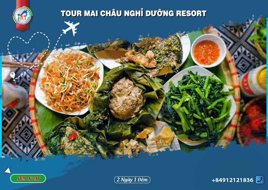 - Thưởng thức món ăn ngon từ Âu sang Á, đặc biệt là các món ăn nổi tiếng tại Mai Châu: Thịt nướng mắc khén; măng đắng, nếp nương, rươi Mai Hạ, cá nướng sông Đà…