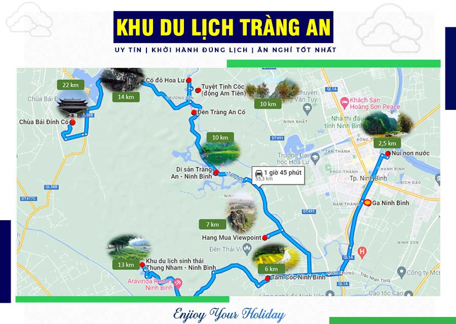 ✔️ Bạn cần nắm rõ khoảng cách giữa các điểm tham quan để sắp xếp chúng thành một lịch trình phù hợp với lộ trình và quãng thời gian mình mong muốn nhất. Nếu lấy khu du lịch Tràng An làm trung tâm thì nó sẽ cách những điểm tham quan ở Tràng An:
