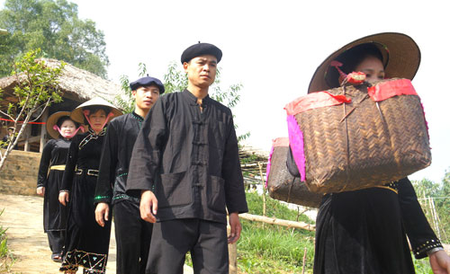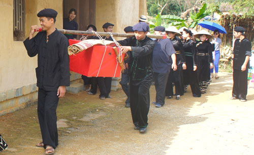 Khi đi, người lớn gánh đồ dự cưới, nhưng đến đầu làng nhường cho trẻ nhỏ gánh đến trước bậc cầu thang của nhà sàn. Gia đình cử một số người đón gánh đồ mang vào nhà; khi đám cưới kết thúc, gia đình trả lại gánh đồ, trong đó có vài lạng thịt lợn, hoặc chân giò, gói xôi, bánh dày có nhân đường và không đường