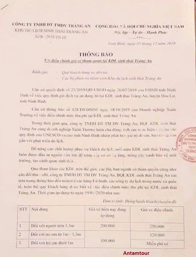 Theo thông báo của công ty TNHH đầu tư thương mại dịch vụ Tràng An đó là: Người có chiều cao từ 1m trở lên. Theo đó giá vé Tràng An: