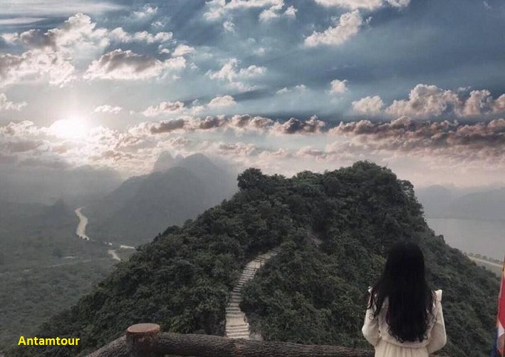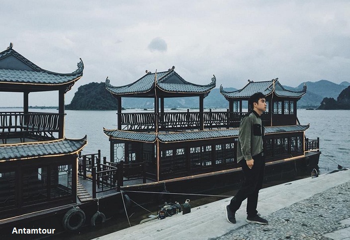 Còn một góc chụp rất đặc biệt, để có được các bức ảnh góc này, du khách phải lựa chọn đi thuyền vào chùa Tam Chúc ( vé khứ hồi giá là 200.000đ/người). Cảnh sắc trên hồ tại đây y như một bức tranh thuỷ mặc với thể núi vòng cung, hồ nước trong vắt cùng bầu trời cao vời vợi.