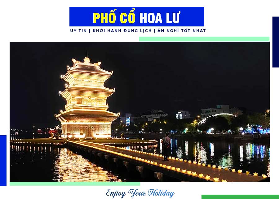 Điểm nhấn đặc biệt khi bạn đến với phố cổ Hoa Lư vào ban đêm, hai tòa bảo tháp bên cạnh khu phố cổ được thắp đền điện phát sáng lung linh. Bởi thế bạn sẽ cảm nhận được sự lung linh, ảo diệu tại nơi đây.