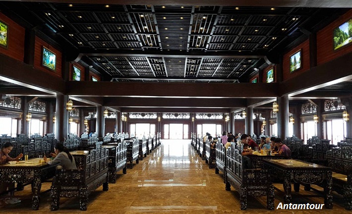 Bàn ghế tại nhà hàng đều bằng gỗ được chạm khắc cự kì sang trọng, mon ăn cũng khá đa dạng, ngon miệng, phục vụ cả món chay mà món mặn. Biết là để phục vụ nhu cầu của du khách, hoàn thiện dịch vụ nhưng món mặn có mặt trong chùa cũng gây ra nhiều ý kiến trái chiều.
