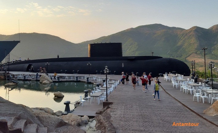 ✅ Điểm nhấn cũng như tên gọi của khu du lịch đó là chiếc tàu ngầm được mô phỏng y như thật, nguyên mẫu là chiếc tàu ngầm Kilo 636 ở quân cảng Cam Ranh, giống cả về hình dáng, kích thước, tỉ lệ. Chiếc tàu dài hơm 70m, bề ngang 10m, kết cấu bằng bê tông cốt thép , lớp vỏ giày hơn 15cm.