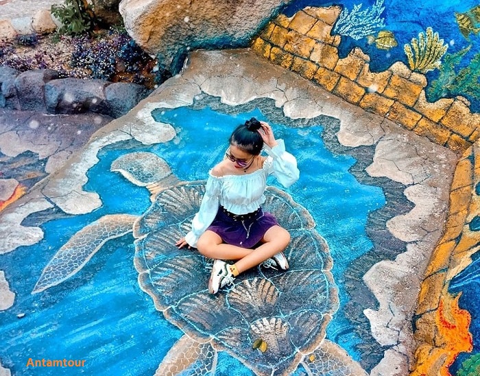 ✅ Thiết kế không gian của khu du lịch rất hài hoá, có một khu mô tả lại nét đẹp văn hoá lịch sử, có khu nhà hàng quán ba ẩn dầu dưới chiếc tàu ngầm. Một khu dành cho khôn gian xanh, thoáng đãng với thác nước, hoàn non bộ, đàn cá và câu cối. một không gian nữa rất được ưa chuộng đó là những bức tranh 3D đầy tài hoa, được các nghệ nhân cẩn thận tạo nên, tỉ mỉ đến từng chi tiết.
