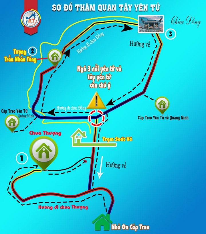 Qua trạm kiểm soát vé thắng cảnh Yên Tử nằm giữa Bắc Giang và Quảng Ninh, đi thêm một đoạn, du khách sẽ gặp ngã ba( vị trí khoanh trong trên bản đồ). Tại địa điểm này, du khách đi theo đường bên trái hay bên phải đều dẫn đến chùa Đồng Yên Tử.