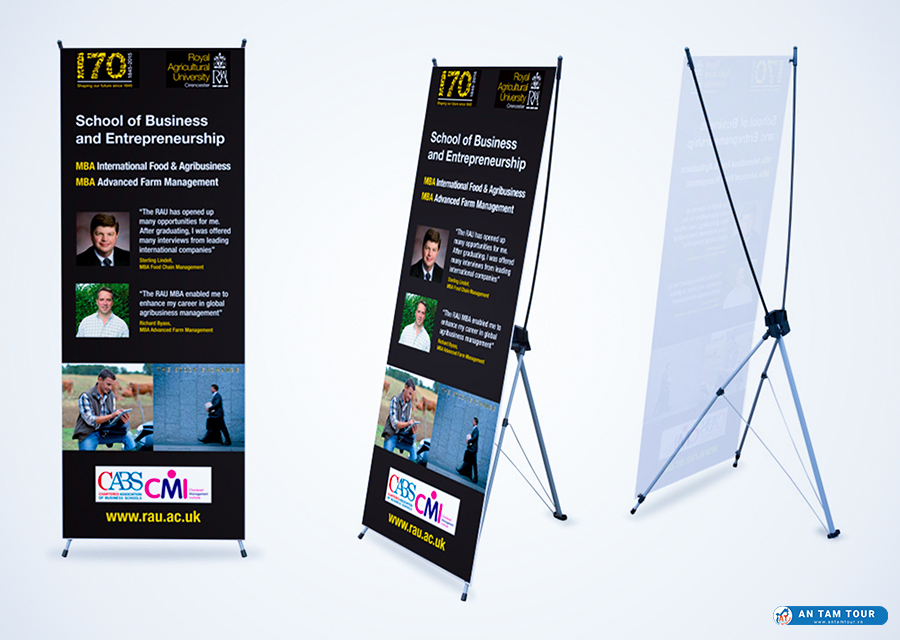 - Ngoài trời: cần dùng standee có khung chắc chắn và chịu được thời tiết như standee khung sắt.