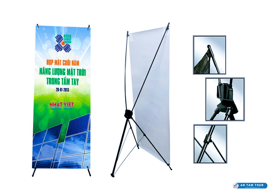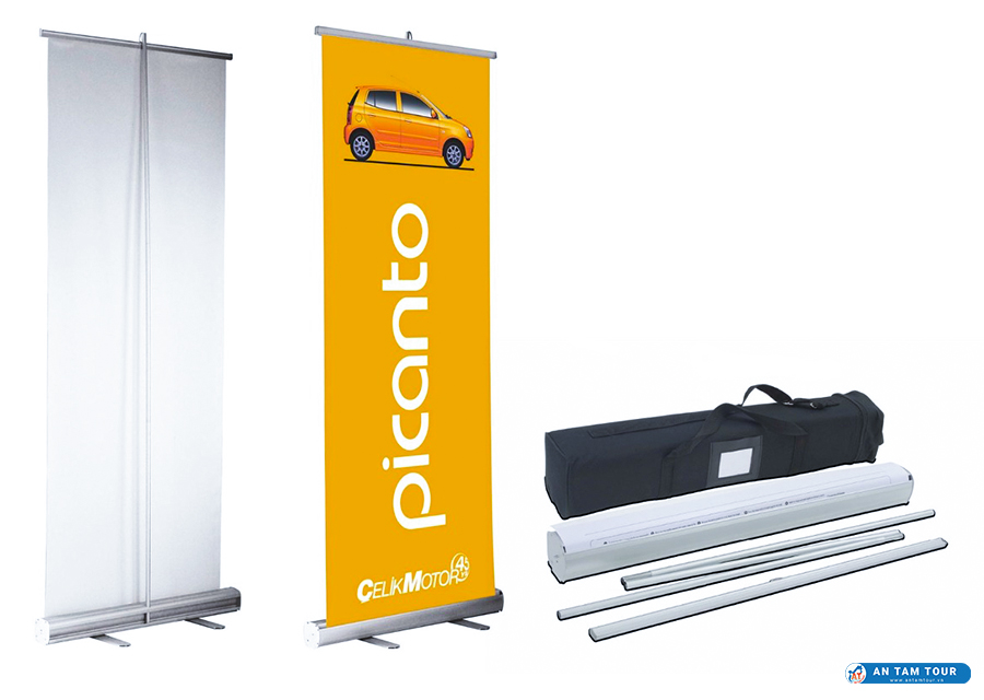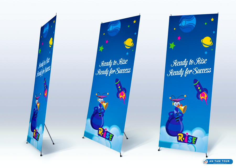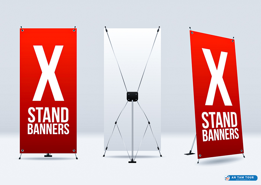 - Trong nhà: chọn các loại standee nhẹ và dễ di chuyển như standee chữ X, standee cuốn hoặc standee banner.