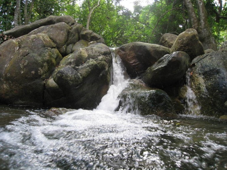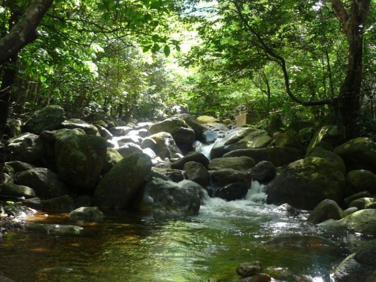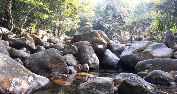 Gặp suối giải oan chính là một trong những điểm dưng chân của chuyến đi, giữa núi rừng đại ngàn mát lạnh, nghe tiếng xào xạc của lá cây, màu tím lịm của hoa sim, cây cối rậm rạp, đã nghe thấy tiếng suối róc rách và dòng suối trong veo, uốn khúc, êm đềm chảy trên nền đá cuội, sỏi trắng, tạo thành giai điệu trầm buồn như tiếng thì thầm của rừng thiêng.