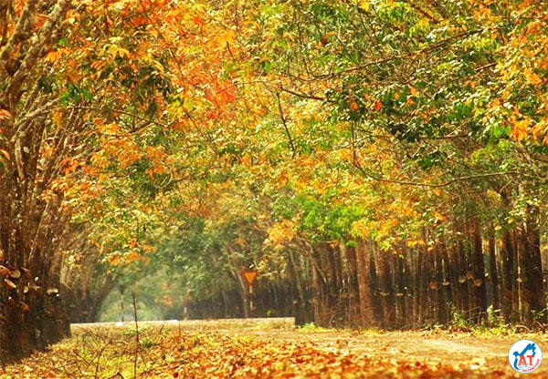 Đi sâu vào những tán rừng cao su, Hai bên đường những rừng cao su chuyển màu, lá mang sắc đỏ và báo hiệu mùa cao su rụng lá. Phong cảnh ấy đưa những du khách đi vào một bức tranh tuyệt đẹp, khiến bao nhiêu mệt mỏi trên đường đi dường như tan biến hết.