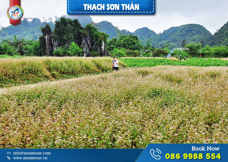 Nếu bạn ghé Thạch Sơn Thần vào đúng mùa hoa tam giác mạch thì sẽ được chiêm ngưỡng khung cảnh khối đá gồm 7 chiếc cột đá vôi này nằm giữa một cánh đồng tam giác mạch bao la bát ngát. Hãy chú ý khoảng thời gian này nhé!