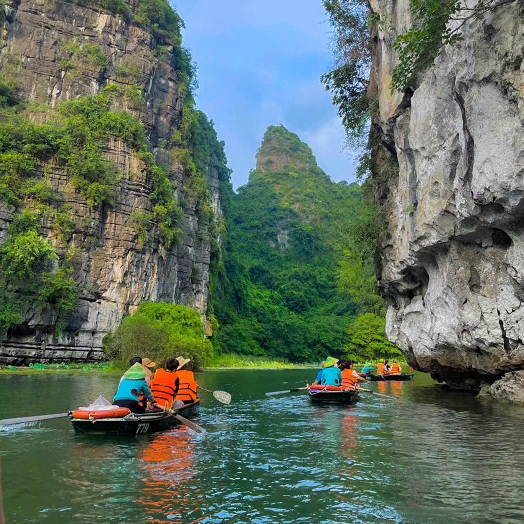 Sau bữa trưa, Quý khách ra ôtô đi tham quan khu du lịch Tràng An, quý khách lên thuyền đi dọc theo suối giữa cánh đồng lúa thăm khu du lịch Tràng An nơi những dải đá vôi, thung lũng và những sông ngòi đan xen tạo nên một không gian huyền ảo, kỳ bí ngạc nhiên đến ngỡ ngàng chưa từng có cho quý khách.