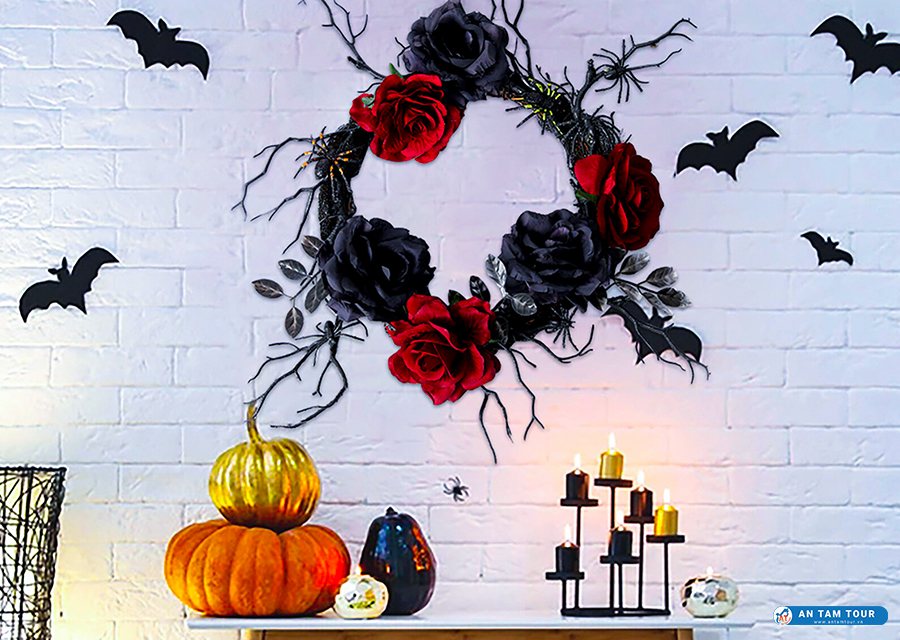 Antamtour gợi ý đến bạn thêm một cách trang trí Halloween mới lạ nhưng cũng không kém phần hấp dẫn đó chính là vòng hoa kết hợp hợp với các phụ kiện trang trí khác.