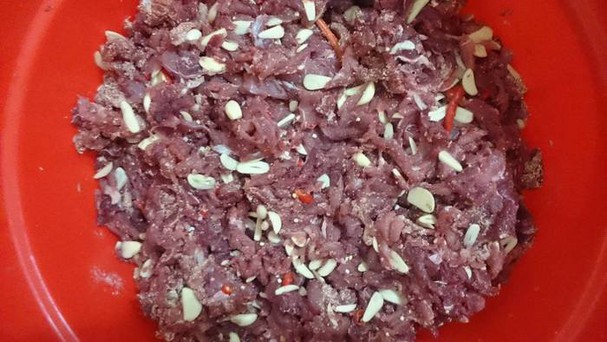- Bước 2: Đem thịt ướp với muối khoảng 1 giờ đồng hồ (lưu ý không ướp mặn quá và cũng không được ướp nhạt quá vì như thế sẽ làm hỏng thịt).
