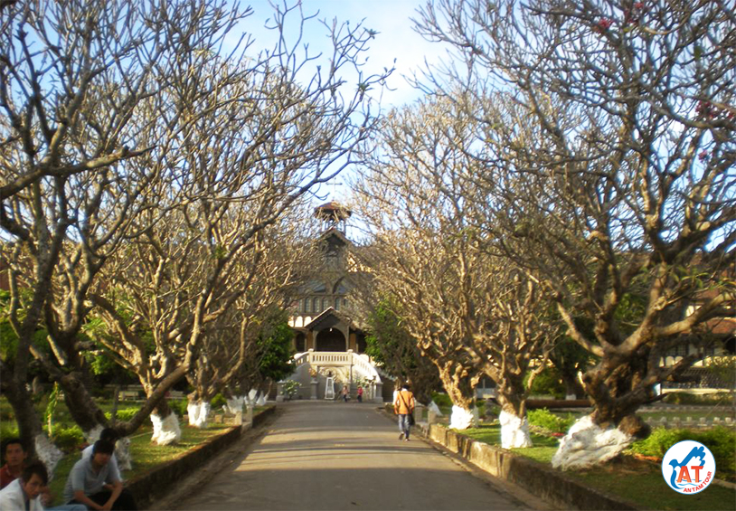 Ngay từ cổng vào, du khách đã thấy cô cùng ấn tượng với hai hàng hoa sứ nhã nhặn được trồng dọc hai lối đi, tỏa mùi hương dìu dịu.