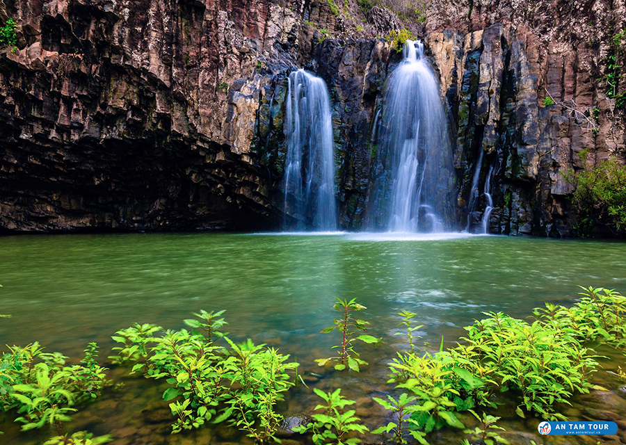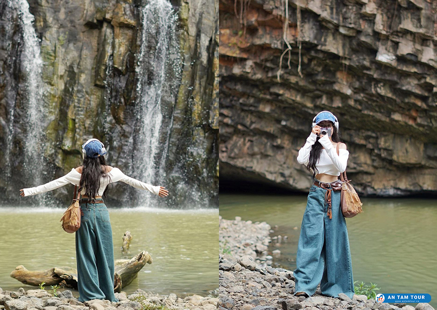 Bên cạnh đó, những dãy đá xếp chồng lên nhau, tương tự Gành Đá Đĩa nổi tiếng, càng làm cho cảnh sắc nơi đây thêm phần kỳ ảo. Nước từ độ cao 20m đổ xuống, bọt tung trắng xóa, khi ánh nắng chiếu rọi, tạo thành những dải cầu vồng lung linh tuyệt đẹp.