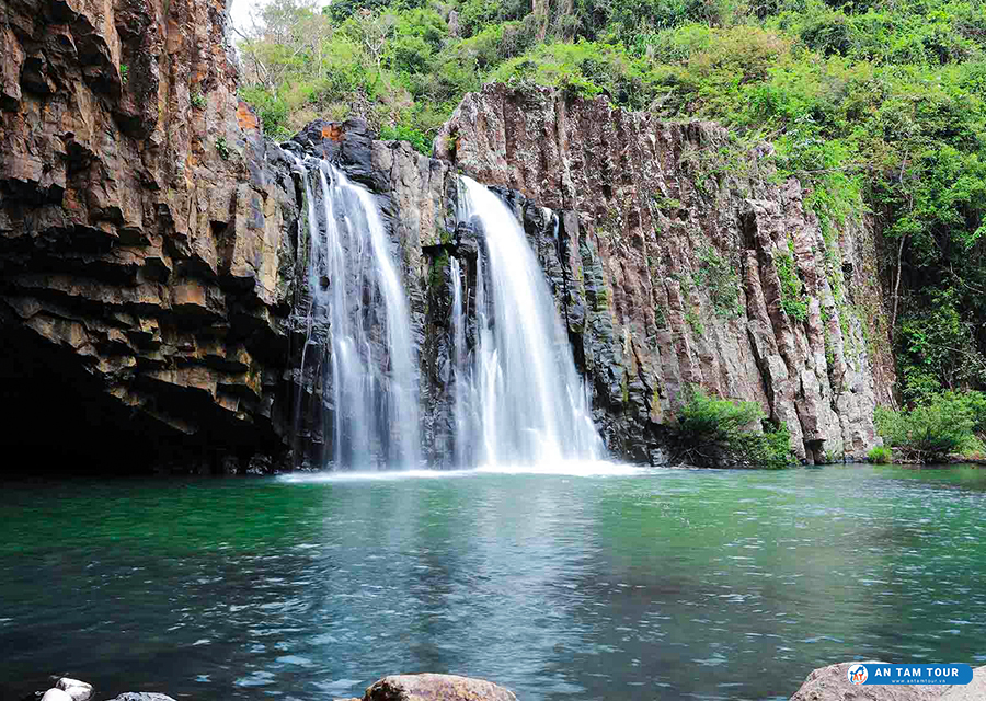 Dưới chân thác là một hồ nước rộng lớn, trong lành giữa khung cảnh vách đá hùng vĩ bao quanh cùng với các tán cây rừng. Thác đổ ì ầm vào mùa mưa nhưng mùa khô có thể không có giọt nước, ngoài nước trong hồ bên dưới. Bởi vì phía dưới thác là đá, lâu ngày đóng rong rêu nên muốn tắm bạn cần trang bị áo phao cho an toàn.