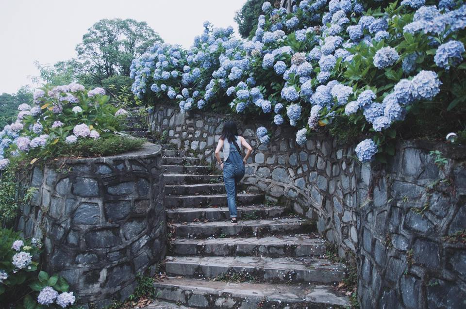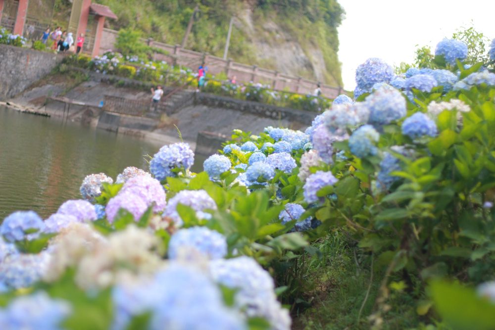 - Ngay từ lỗi vào bạn đã thấy từng chùm hoa tú cầu chen chúc nhau trên sườn của tường rào đá. Tú cầu nơi đây hầu hết được trồng thành từng khóm, nhưng nhiều nhất là dọc 2 bên bờ hồ, cây ra hoa phủ kín cả 2 dọc bờ hồ.