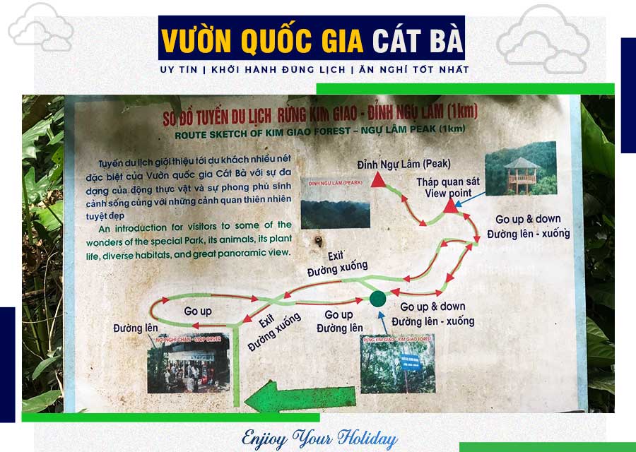 Hệ thống rừng tại Vườn quốc gia Cát Bà vô cùng phong phú, đa dạng với hàng trăm loài động thực vật quý hiếm, đặc biệt Rừng Kim Giao độc nhất vô nhị chỉ có ở Cát Bà. Những hoạt động mà bạn có thể trải nghiệm đó là đi bộ trong rừng, trải nghiệm leo núi ngắm cảnh, một trong những địa điểm được du khách lựa chọn chinh phục nhiều nhất là đỉnh Ngự Lâm, nơi có thể ngắm nhìn toàn cảnh hòn đảo Cát Bà xinh đẹp.